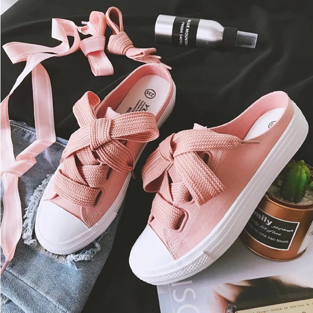 รองเท้า ผ้าใบเปิดส้น เชือกริบบิ้น+ ผ้าสวมง่าย/ใส่สบาย