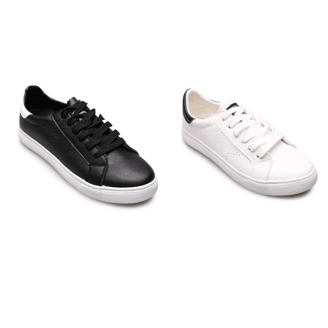 | มี3สี แต่งขอบส้นเก๋ PRE-รองเท้าผ้าใบเกาหลี ดำ+ขาว+ชมพู ดีไซน์เชือกผูก |