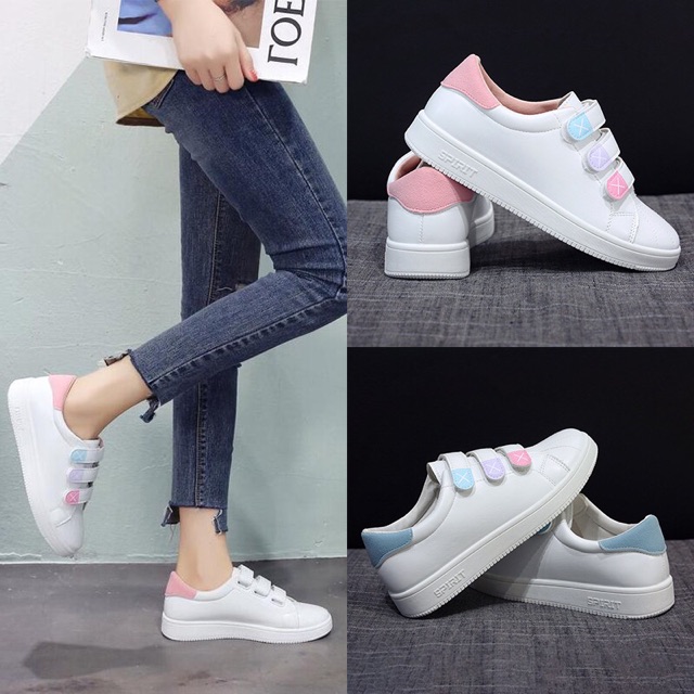 SS083 รองเท้า ผ้าใบแบบแปะ/ตีนตุ๊กแก หนัง PU สี ขาวขอบพาสเทลหวานๆ น่ารัก ฟ้า ชมพู