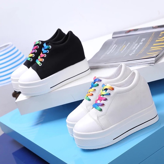 รองเท้า ผ้าใบ เสริมส้น/ส้นตึก เชือกสีรุ้ง สี ขาว ดำ เดรส ชุดคนอ้วน 488-R -